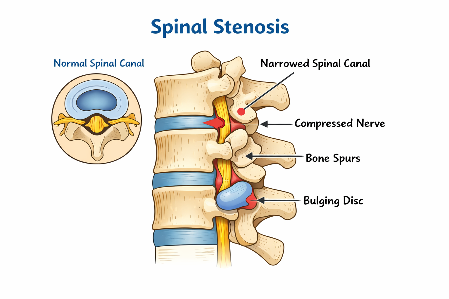 Spinal stenosis occurs when the spaces within the spine become narrowed, placing pressure on the nerves that travel through the spinal canal. This condition most commonly affects the lower back and can lead to symptoms such as pain, numbness, tingling, or weakness in the legs, especially when standing or walking for long periods. Over time, age-related changes like disc degeneration, bone spurs, and thickened ligaments can contribute to this narrowing. Proper evaluation and conservative care can often help reduce pressure on the affected nerves and improve mobility and comfort.