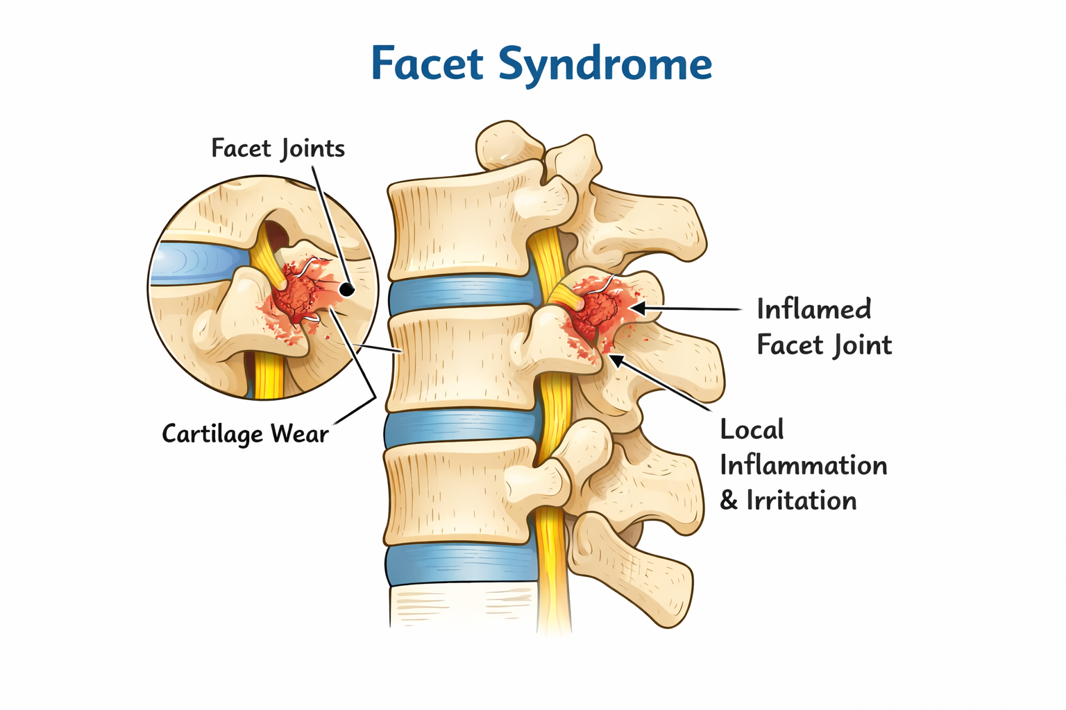 Facet syndrome refers to irritation or inflammation of the small joints located between each vertebra in the spine, called facet joints. These joints allow the spine to bend, twist, and move smoothly. When they become inflamed due to repetitive stress, injury, arthritis, or poor mechanics, they can cause localized back pain and stiffness, particularly with movements like twisting or leaning backward. The discomfort is often felt on one side of the spine and may worsen after prolonged standing or activity.